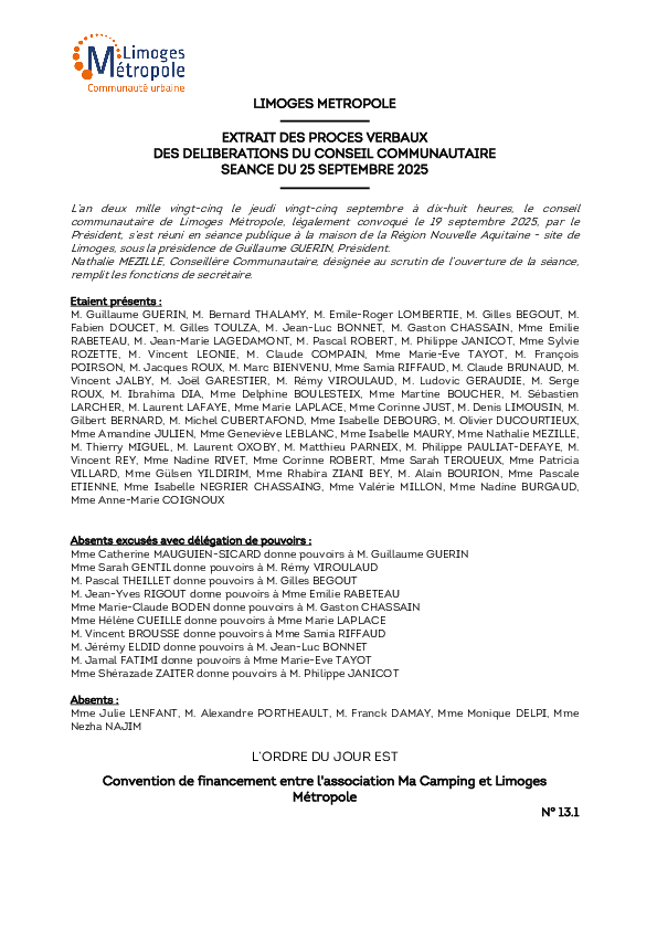 DélibérationConvention de financement entre l'association Ma Camping et Limoges Métropole1 documentPublié le 3 Octobre 2025 Délibération 13.1.pdf (.pdf, 219,7 Ko) Télécharger PrécédentRetour à la listeSuivant