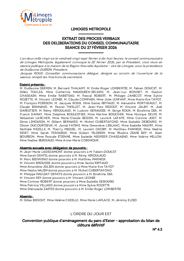 DélibérationConvention publique d’aménagement du parc d’Ester - approbation du bilan de clôture définitif1 documentPublié le 9 Mars 2026 Délibération du 27 février 2026 4_3.pdf (.pdf, 10,1 Mo) Télécharger PrécédentRetour à la listeSuivant