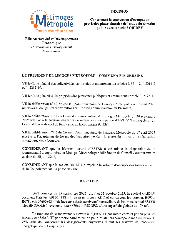 DécisionDécision concernant la convention d’occupation provisoire phase chantier de locaux du domaine public avec la société ORIDEV1 documentPublié le 1 Octobre 2025 27267.pdf (.pdf, 1,1 Mo) Télécharger PrécédentRetour à la listeSuivant