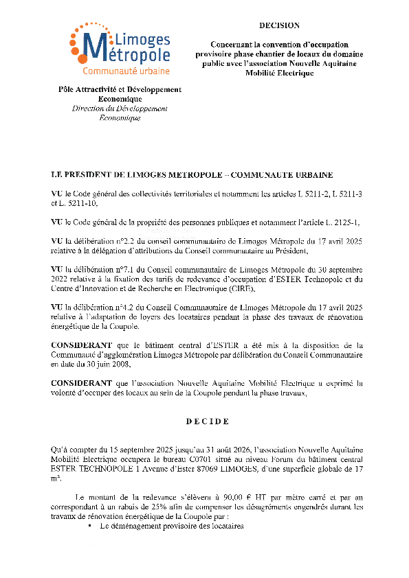 DécisionDécision concernant la convention d’occupation provisoire phase chantier de locaux du domaine public avec l’association Nouvelle Aquitaine Mobilité Electrique1 documentPublié le 1 Octobre 2025 27265.pdf (.pdf, 1,0 Mo) Télécharger PrécédentRetour à la listeSuivant