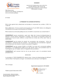 DécisionDécision concernant la déclaration sans suite d’un marché afférent à des travaux de désamiantage du bâtiment central d’Ester Technopole à Limoges1 documentPublié le 18 Décembre 2025 27652.pdf (.pdf, 239,6 Ko) Télécharger PrécédentRetour à la listeSuivant