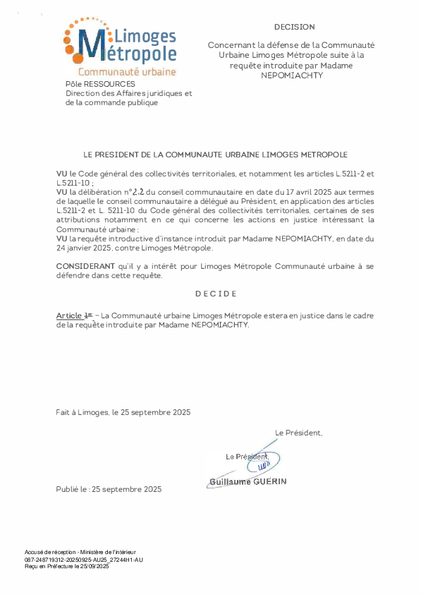 DécisionDécision concernant la défense de la Communauté Urbaine Limoges Métropole suite à la requête introduite par Madame NEPOMIACHTY1 documentPublié le 25 Septembre 2025 27244.pdf (.pdf, 93,1 Ko) Télécharger PrécédentRetour à la listeSuivant