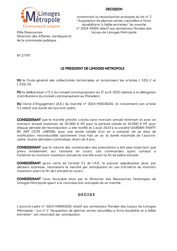 DécisionDécision concernant la reconduction anticipée du lot n° 2 "Acquisition de plantes vertes naturelles à forte durabilité et à faible entretien" du marché n° 2024 M004 relatif aux animations florales des locaux de Limoges Métropole1 documentPublié le 23 Janvier 2026 27797.pdf (.pdf, 237,0 Ko) Télécharger PrécédentRetour à la listeSuivant