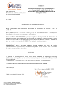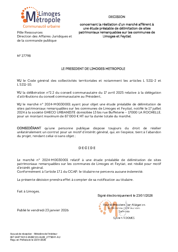 DécisionDécision concernant la résiliation d’un marché afférent à une étude préalable de délimitation de sites patrimoniaux remarquables sur les communes de Limoges et Feytiat1 documentPublié le 23 Janvier 2026 27798.pdf (.pdf, 235,9 Ko) Télécharger PrécédentRetour à la listeSuivant