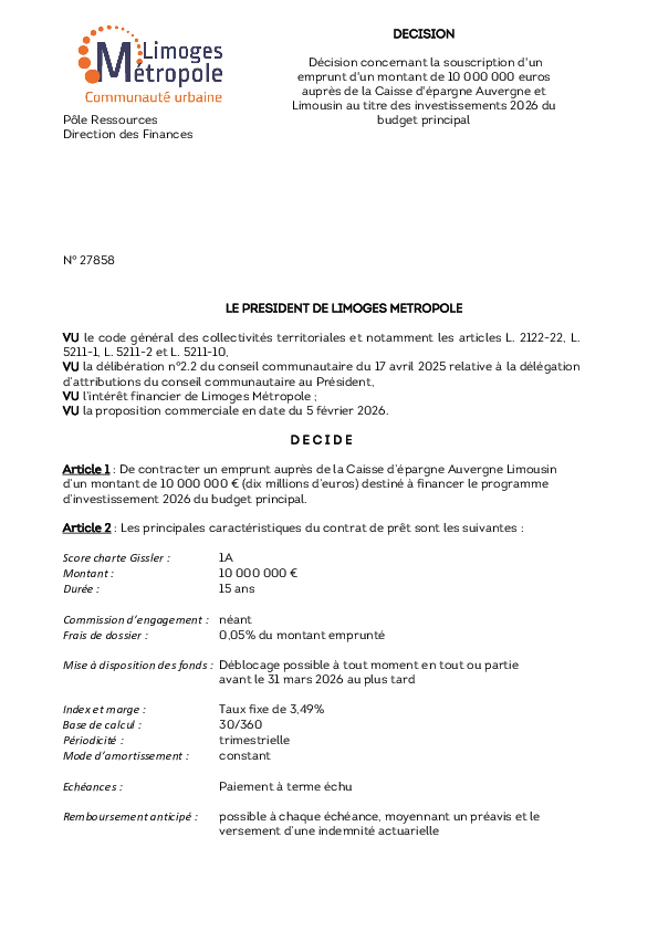 DécisionDécision concernant la souscription d'un emprunt d'un montant de 10 000 000 euros auprès de la Caisse d'épargne Auvergne et Limousin au titre des investissements 2026 du budget principal1 documentPublié le 26 Février 2026 27858.pdf (.pdf, 271,8 Ko) Télécharger PrécédentRetour à la listeSuivant