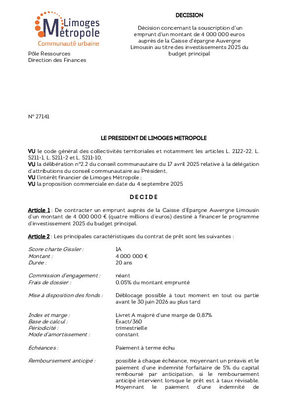 DécisionDécision concernant la souscription d'un emprunt d'un montant de 4 000 000 euros auprès de la Caisse d'épargne Auvergne Limousin au titre des investissements 2025 du budget principal1 documentPublié le 22 Septembre 2025 27141.pdf (.pdf, 239,5 Ko) Télécharger PrécédentRetour à la listeSuivant