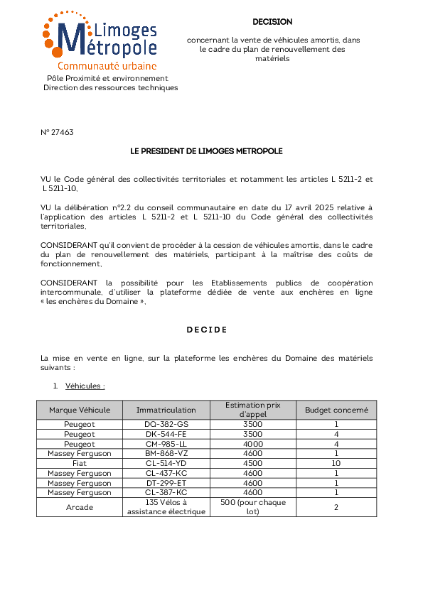 DécisionDécision concernant la vente de véhicules amortis, dans le cadre du plan de renouvellement des matériels1 documentPublié le 28 Octobre 2025 Décision 27463.pdf (.pdf, 203,6 Ko) Télécharger Retour à la listeSuivant