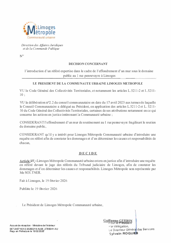 DécisionDécision concernant l'introduction d'un référé expertise dans le cadre de l'effondrement d'un mur sous le domaine public au 1 rue pennevayre à Limoges1 documentPublié le 19 Février 2026 27856.pdf (.pdf, 114,4 Ko) Télécharger PrécédentRetour à la listeSuivant