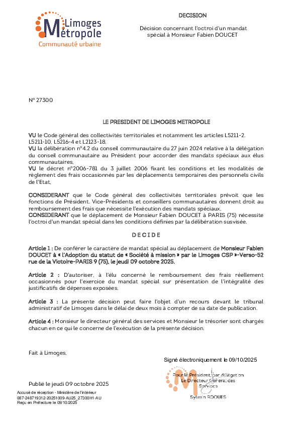 DécisionDécision concernant l'octroi d'un mandat spécial à Monsieur Fabien DOUCET1 documentPublié le 9 Octobre 2025 27300.pdf (.pdf, 235,6 Ko) Télécharger PrécédentRetour à la listeSuivant