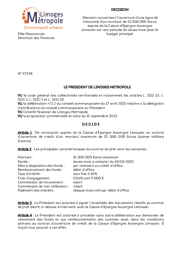 DécisionDécision concernant l'ouverture d'une ligne de trésorerie d'un montant de 15 000 000 Euros auprès de la Caisse d'Epargne Auvergne Limousin sur une période de douze mois pour le budget principal1 documentPublié le 3 Octobre 2025 27248.pdf (.pdf, 236,7 Ko) Télécharger PrécédentRetour à la listeSuivant