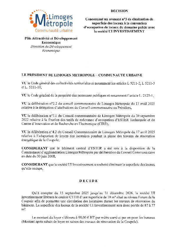 DécisionDécision concernant un avenant n°3 de diminution de superficie des locaux à la convention d’occupation de locaux du domaine public avec la société UI INVESTISSEMENT1 documentPublié le 1 Octobre 2025 27270.pdf (.pdf, 1,0 Mo) Télécharger PrécédentRetour à la listeSuivant