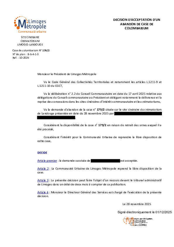 DécisionDécision d'acceptation d'un abandon de case de colombarium - 179-21 documentPublié le 2 Décembre 2025 DEC_FUNER_179_2_ABANDON_CASE.pdf (.pdf, 326,2 Ko) Télécharger PrécédentRetour à la listeSuivant