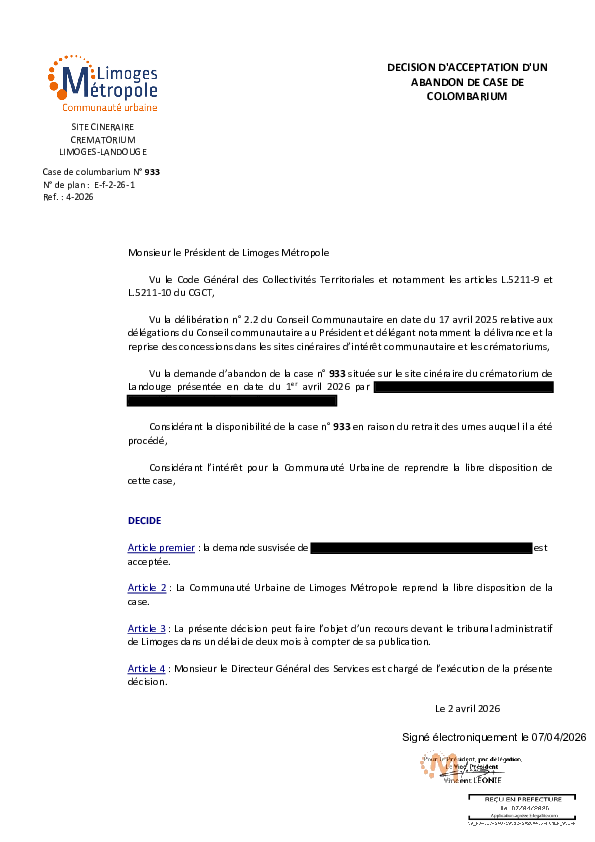 Décision d'acceptation d'un abandon de case de colombarium - 933