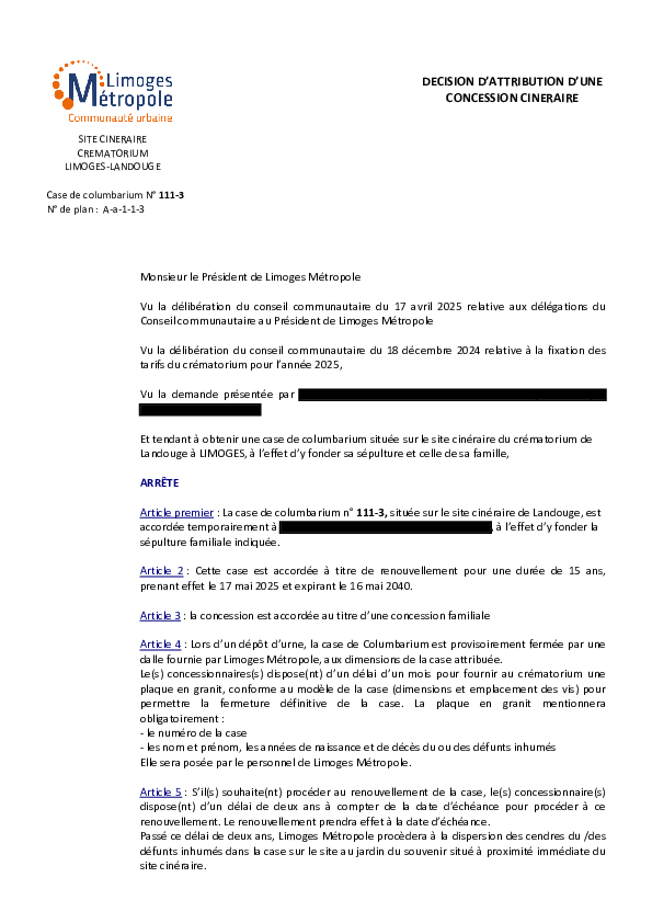 DécisionDécision d'attribution d'une concession cinéraire - 111_31 documentPublié le 17 Novembre 2025 DEC_FUNER_111_3_ATTRIBUTION_CONCESSION.pdf (.pdf, 328,6 Ko) Télécharger PrécédentRetour à la listeSuivant