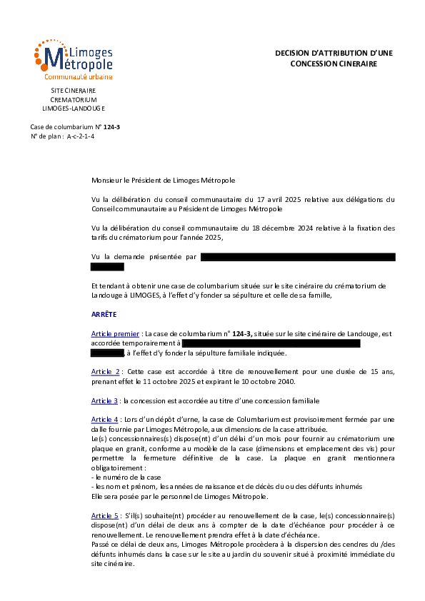 DécisionDécision d'attribution d'une concession cinéraire - 124_31 documentPublié le 15 Octobre 2025 DEC_FUNER__124_3_ATTRIBUTION_CONCESSION.pdf (.pdf, 329,4 Ko) Télécharger PrécédentRetour à la listeSuivant