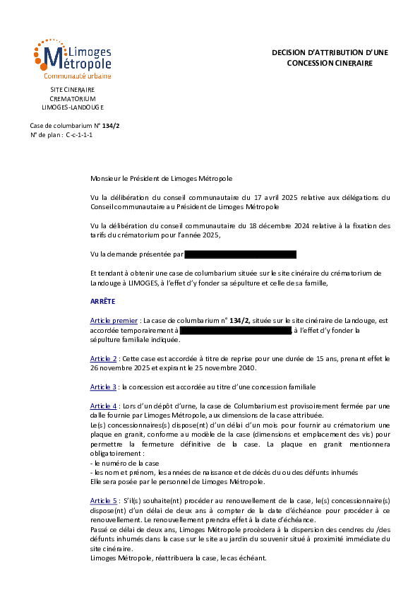 DécisionDécision d'attribution d'une concession cinéraire - 134-21 documentPublié le 2 Décembre 2025 DEC_FUNER_134_2_ATTRIBUTION_CONCESSION.pdf (.pdf, 518,9 Ko) Télécharger PrécédentRetour à la listeSuivant