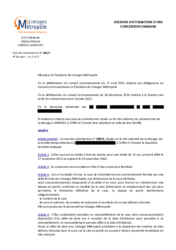 DécisionDécision d'attribution d'une concession cinéraire - 280-21 documentPublié le 2 Décembre 2025 DEC_FUNER_280_2_ATTRIBUTION_CONCESSION.pdf (.pdf, 524,5 Ko) Télécharger PrécédentRetour à la listeSuivant