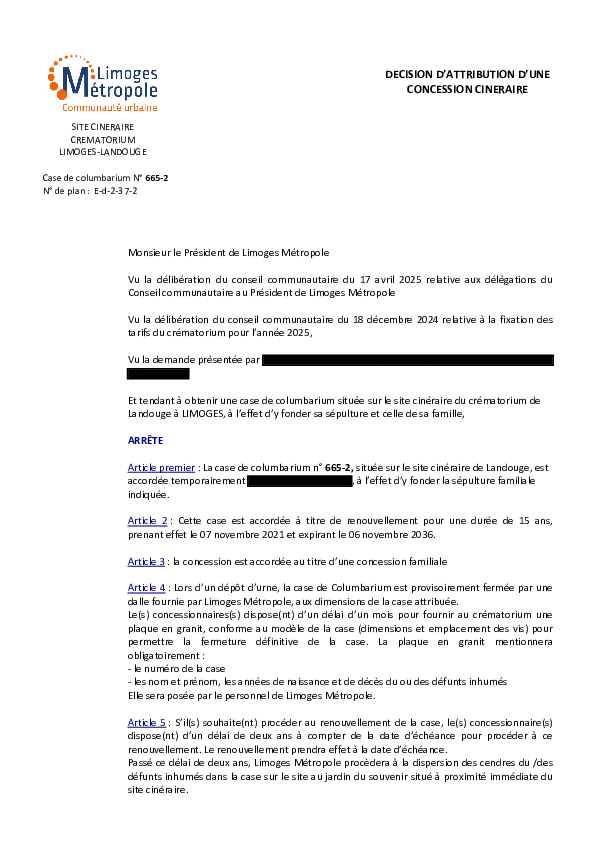 DécisionDécision d'attribution d'une concession cinéraire - 665_21 documentPublié le 15 Décembre 2025 DEC_FUNER_665_2_ATTRIBUTION_CONCESSION.pdf (.pdf, 329,2 Ko) Télécharger PrécédentRetour à la listeSuivant