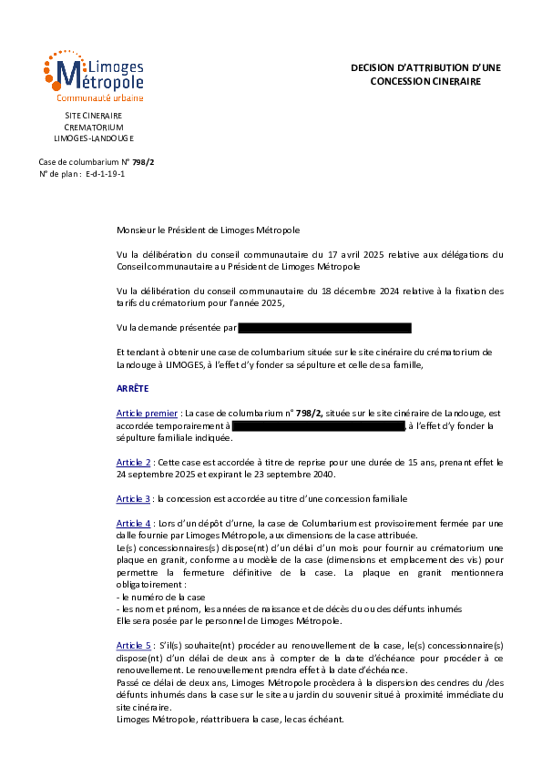 DécisionDécision d'attribution d'une concession cinéraire - 798_21 documentPublié le 26 Septembre 2025 DEC_FUNER__798_2_ATTRIBUTION_CONCESSION.pdf (.pdf, 330,1 Ko) Télécharger PrécédentRetour à la listeSuivant