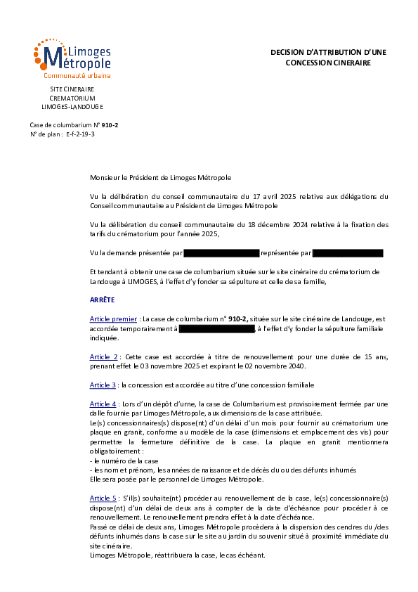 DécisionDécision d'attribution d'une concession cinéraire - 910_21 documentPublié le 9 Octobre 2025 DEC_FUNER__910_2_ATTRIBUTION_CONCESSION.pdf (.pdf, 330,7 Ko) Télécharger PrécédentRetour à la listeSuivant