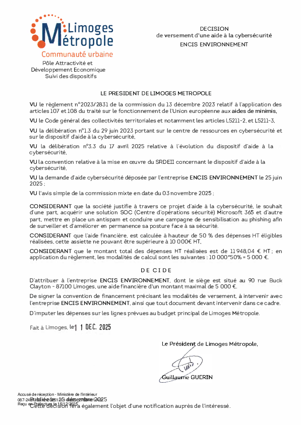 DécisionDécision de versement d une aide à la cybersécurité à l'entreprise ENCIS ENVIRONNEMENT1 documentPublié le 15 Décembre 2025 27684.pdf (.pdf, 115,1 Ko) Télécharger PrécédentRetour à la listeSuivant