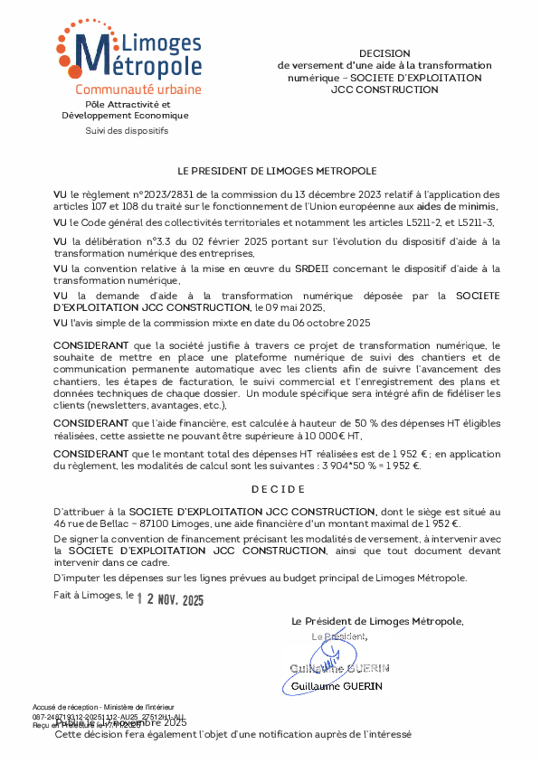 DécisionDécision de versement d une aide à la transformation numérique à la société d'exploitation JCC CONSTRUCTION1 documentPublié le 17 Novembre 2025 27512.pdf (.pdf, 103,5 Ko) Télécharger PrécédentRetour à la listeSuivant