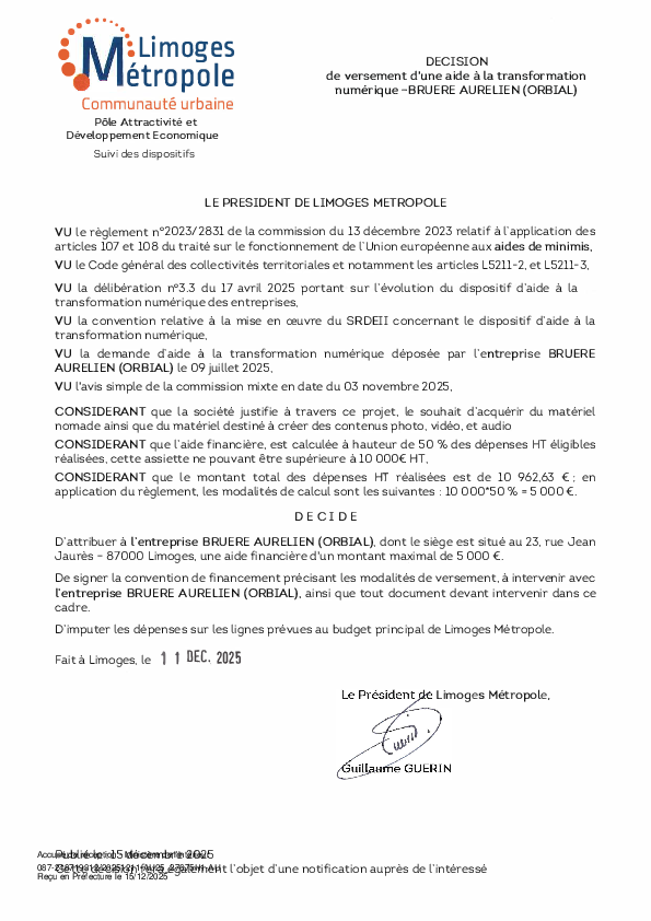 DécisionDécision de versement d une aide à la transformation numérique à l'entreprise BRUERE AURELIEN (ORBIAL)1 documentPublié le 15 Décembre 2025 27675.pdf (.pdf, 122,9 Ko) Télécharger PrécédentRetour à la listeSuivant