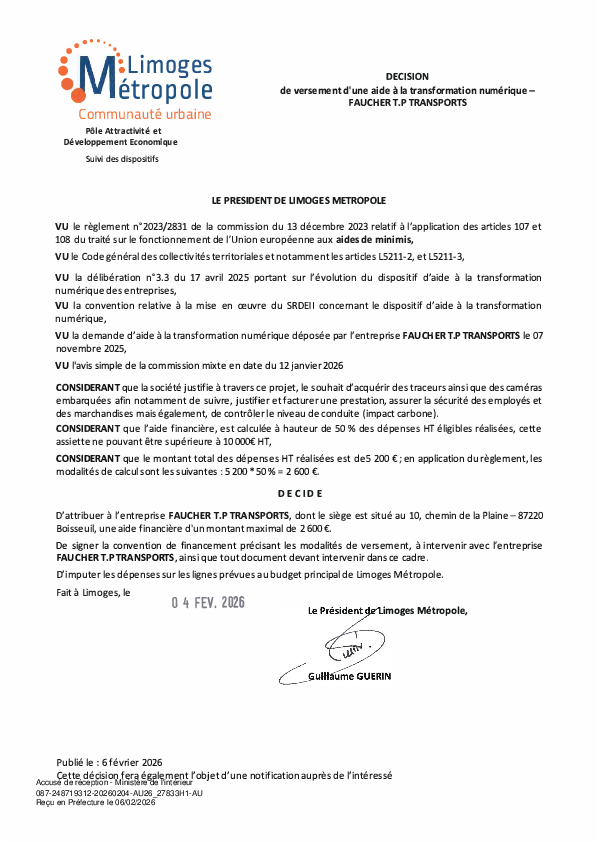 DécisionDécision de versement d une aide à la transformation numérique à l'entreprise FAUCHER TP TRANSPORTS1 documentPublié le 6 Février 2026 27833.pdf (.pdf, 92,2 Ko) Télécharger PrécédentRetour à la listeSuivant