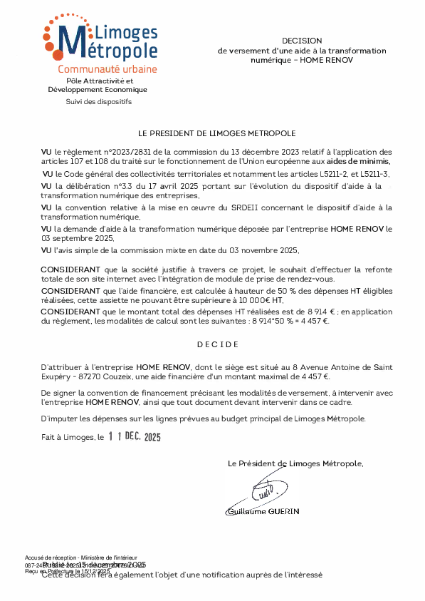 DécisionDécision de versement d une aide à la transformation numérique à l'entreprise HOME RENOV1 documentPublié le 15 Décembre 2025 27676.pdf (.pdf, 110,4 Ko) Télécharger PrécédentRetour à la listeSuivant