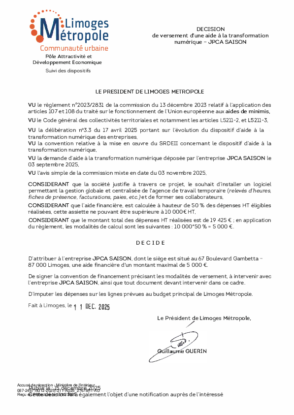 DécisionDécision de versement d une aide à la transformation numérique à l'entreprise JPCA SAISON1 documentPublié le 15 Décembre 2025 27678.pdf (.pdf, 123,7 Ko) Télécharger PrécédentRetour à la listeSuivant