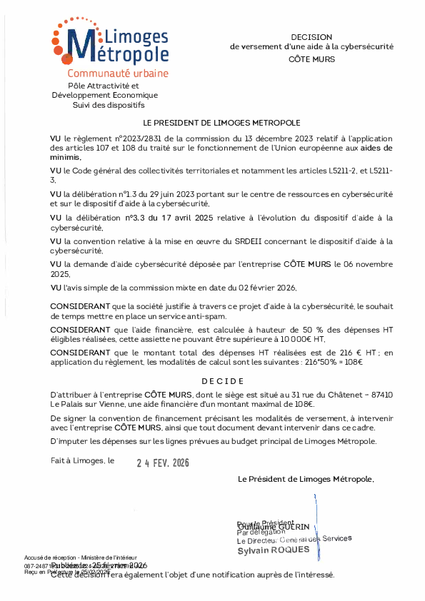 DécisionDécision de versement d'une aide à la cybersécurité à l'entreprise COTE MURS1 documentPublié le 25 Février 2026 27879.pdf (.pdf, 89,1 Ko) Télécharger PrécédentRetour à la listeSuivant