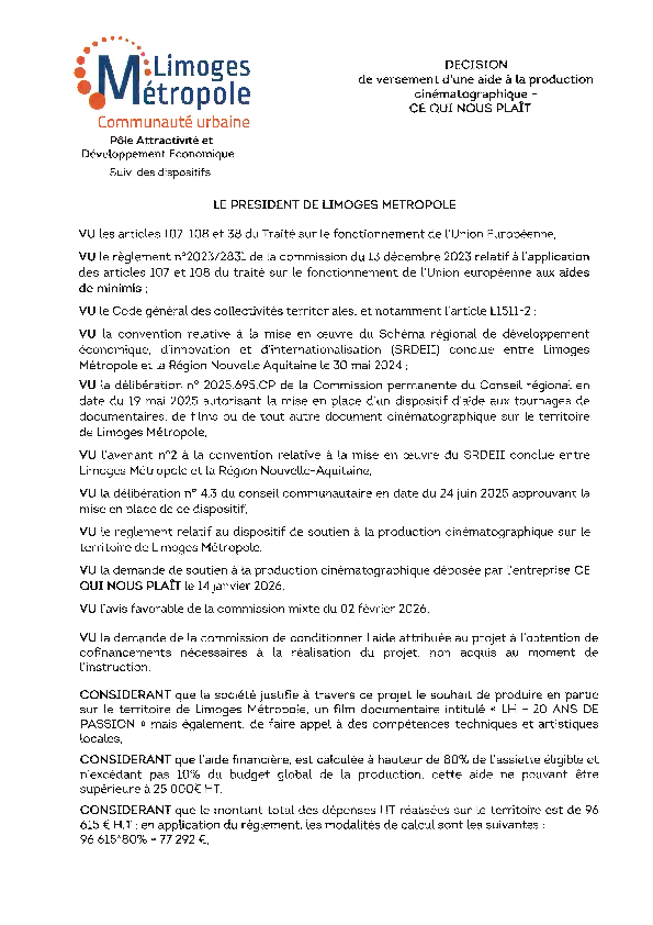 DécisionDécision de versement d'une aide à la production cinématographique à l'entreprise CE QUI NOUS PLAIT1 documentPublié le 25 Février 2026 27885.pdf (.pdf, 239,7 Ko) Télécharger PrécédentRetour à la listeSuivant