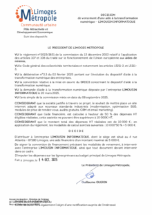DécisionDécision de versement d'une aide à la transformation numérique à l'entreprise LIMOUSIN INFORMATIQUE1 documentPublié le 14 Octobre 2025 27319.pdf (.pdf, 78,8 Ko) Télécharger PrécédentRetour à la listeSuivant