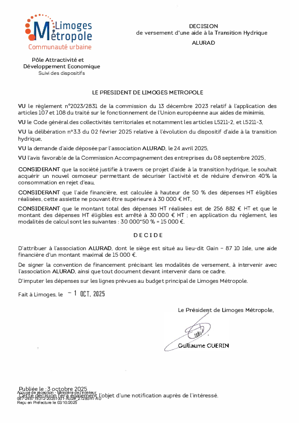 DécisionDécision de versement d'une aide à la transition hydrique à l'association ALURAD1 documentPublié le 3 Octobre 2025 27280.pdf (.pdf, 96,0 Ko) Télécharger PrécédentRetour à la listeSuivant