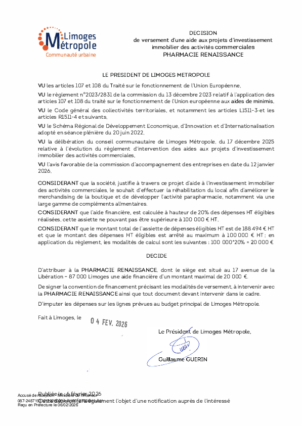DécisionDécision de versement d'une aide aux projets d'investissement immobilier des activités commerciales à la PHARMACIE RENAISSANCE1 documentPublié le 6 Février 2026 27836.pdf (.pdf, 100,4 Ko) Télécharger PrécédentRetour à la listeSuivant