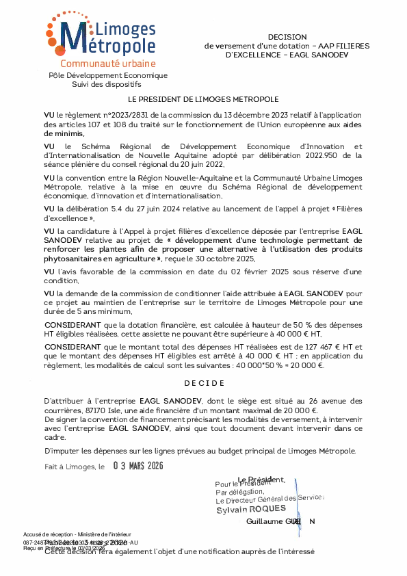 DécisionDécision de versement d'une dotation - AAP FILIERES D EXCELLENCE - EAGL SANODEV1 documentPublié le 3 Mars 2026 27918.pdf (.pdf, 84,4 Ko) Télécharger PrécédentRetour à la listeSuivant
