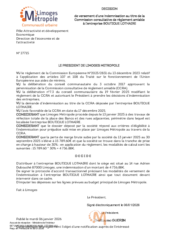 DécisionDécision de versement d'une indemnisation au titre de la Commission Consultative de Règlement Amiable à l'entreprise BOUTIQUE LOTHAIRE1 documentPublié le 6 Janvier 2026 27715.pdf (.pdf, 216,9 Ko) Télécharger PrécédentRetour à la listeSuivant