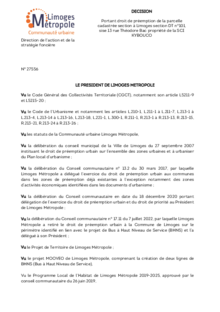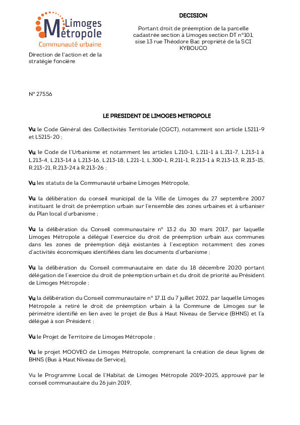 DécisionDécision portant droit de préemption de la parcelle cadastrée section à Limoges section DT n°101, sise 13 rue Théodore Bac propriété de la SCI KYBOUCO1 documentPublié le 4 Décembre 2025 27556.pdf (.pdf, 967,9 Ko) Télécharger PrécédentRetour à la listeSuivant