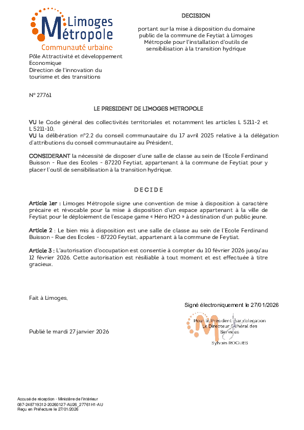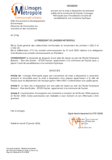 DécisionDécision portant sur la mise à disposition du domaine public de la commune de Feytiat à Limoges Métropole pour l'installation d'outils de sensibilisation à la transition hydrique1 documentPublié le 27 Janvier 2026 27761.pdf (.pdf, 205,3 Ko) Télécharger PrécédentRetour à la listeSuivant