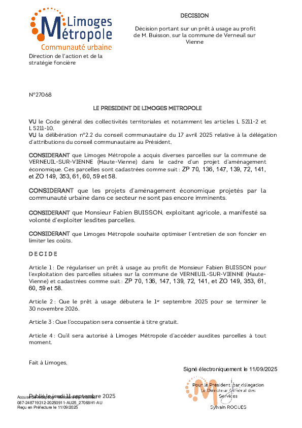 DécisionDécision portant sur un prêt à usage au profit de M. Buisson, sur la commune de Verneuil sur Vienne1 documentPublié le 11 Septembre 2025 27068_01.pdf (.pdf, 220,5 Ko) Télécharger PrécédentRetour à la listeSuivant