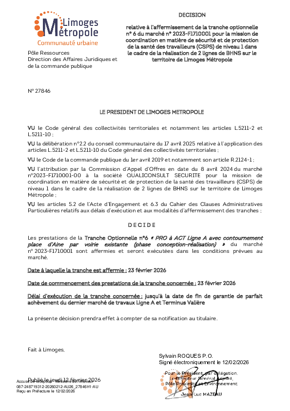 DécisionDécision relative à l’affermissement de la tranche optionnelle n° 6 du marché n° 2023-F1710001 pour la mission de CSPS des travailleurs de niveau 1 dans le cadre de la réalisation de 2 lignes de BHNS sur le territoire de Limoges Métropole1 documentPublié le 12 Février 2026 27846.pdf (.pdf, 248,7 Ko) Télécharger Retour à la listeSuivant