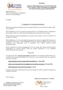 DécisionDécision relative à l’affermissement de la Tranche Optionnelle n°3 du marché n° 2022-F097 afférent à la réalisation d’un schéma directeur global d’assainissement1 documentPublié le 11 Mars 2026 27929.pdf (.pdf, 239,4 Ko) Télécharger PrécédentRetour à la listeSuivant