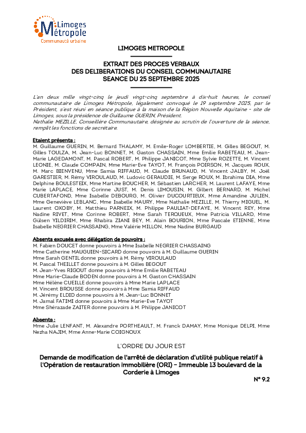 DélibérationDemande de modification de l'arrêté de déclaration d'utilité publique relatif à l'Opération de restauration immobilière (ORI) – Immeuble 13 boulevard de la Corderie à Limoges1 documentPublié le 29 Septembre 2025 Délibération du 25 septembre 2025 9_2.pdf (.pdf, 218,1 Ko) Télécharger PrécédentRetour à la listeSuivant