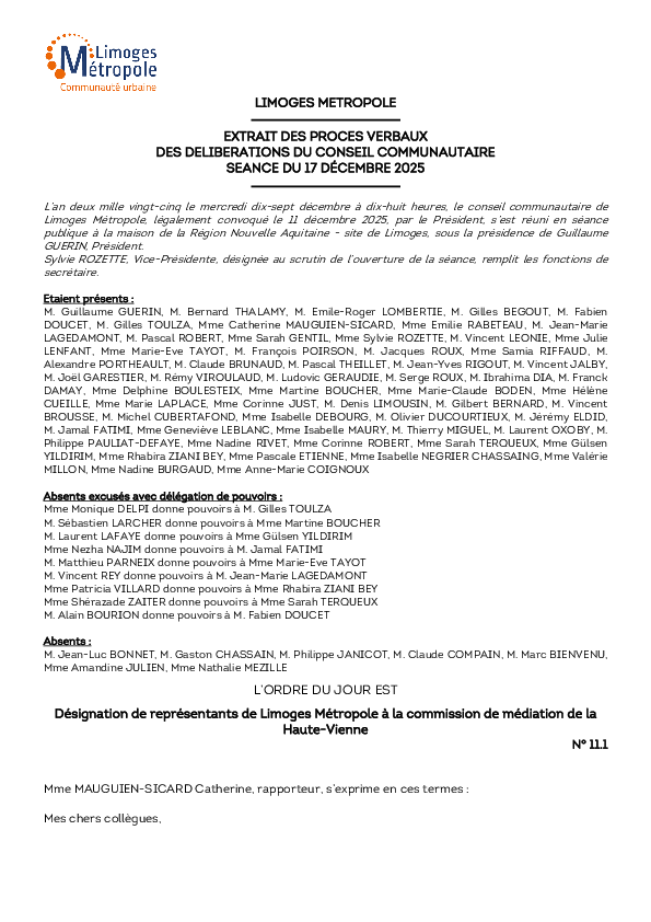 DélibérationDésignation de représentants de Limoges Métropole à la commission de médiation de la Haute-Vienne1 documentPublié le 23 Décembre 2025 Délibération du 17 décembre 2025 11_1.pdf (.pdf, 217,9 Ko) Télécharger PrécédentRetour à la listeSuivant
