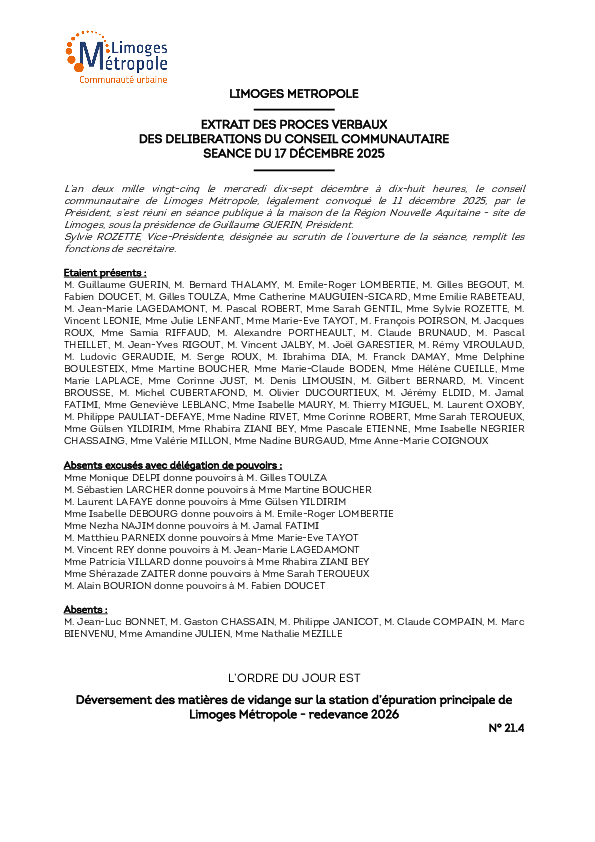 DélibérationDéversement des matières de vidange sur la station d’épuration principale de Limoges Métropole - redevance 20261 documentPublié le 23 Décembre 2025 Délibération du 17 décembre 2025 21_4.pdf (.pdf, 519,8 Ko) Télécharger PrécédentRetour à la listeSuivant