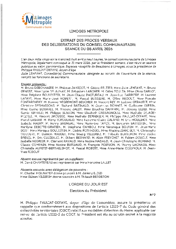 DélibérationElection du Président1 documentPublié le 8 Avril 2026 Délibération du 8 avril 2026 2.pdf (.pdf, 448,5 Ko) Télécharger PrécédentRetour à la listeSuivant