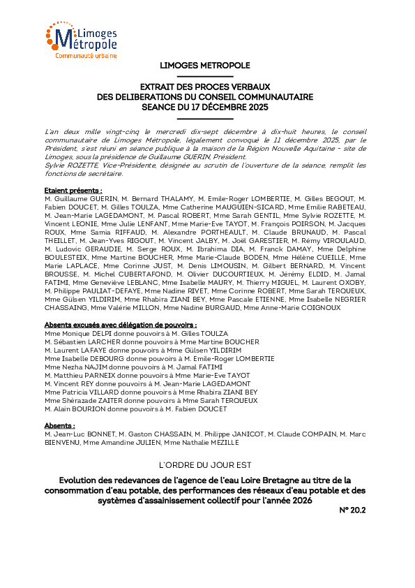 DélibérationEvolution des redevances de l’agence de l’eau Loire Bretagne au titre de la consommation d’eau potable, des performances des réseaux d’eau potable et des systèmes d’assainissement collectif pour l’année 20261 documentPublié le 23 Décembre 2025 Délibération du 17 décembre 2025 20_2.pdf (.pdf, 223,1 Ko) Télécharger PrécédentRetour à la listeSuivant
