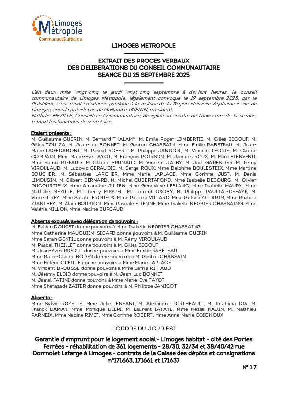 DélibérationGarantie d'emprunt pour le logement social - Limoges habitat - cité des Portes Ferrées - réhabilitation de 361 logements - 28/30, 32/34 et 38/40/42 rue Domnolet Lafarge à Limoges1 documentPublié le 3 Octobre 2025 Délibération du 25 septembre 2025 1_7.pdf (.pdf, 9,4 Mo) Télécharger PrécédentRetour à la listeSuivant