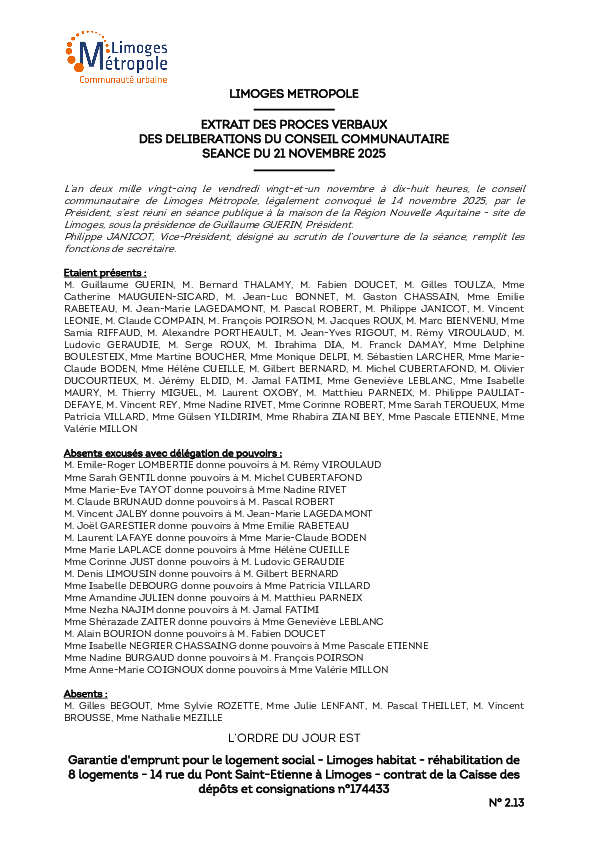 DélibérationGarantie d'emprunt pour le logement social - Limoges habitat - réhabilitation de 8 logements - 14 rue du Pont Saint-Etienne à Limoges - contrat de la Caisse des dépôts et consignations n°1744331 documentPublié le 27 Novembre 2025 Délibération du 21 novembre 2025 2_13.pdf (.pdf, 1,0 Mo) Télécharger PrécédentRetour à la listeSuivant