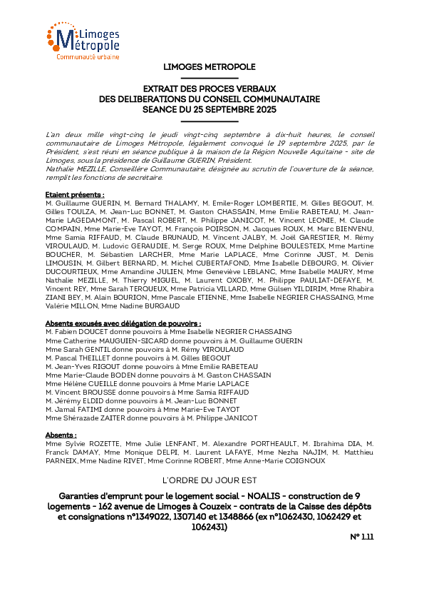 DélibérationGaranties d'emprunt pour le logement social - NOALIS - construction de 9 logements - 162 avenue de Limoges à Couzeix - contrats de la Caisse des dépôts et consignations n°1349022, 1307140 et 1348866 (ex n° 1062430, 1062429 et 1062431)1 documentPublié le 3 Octobre 2025 Délibération du 25 septembre 2025 1_11.pdf (.pdf, 4,8 Mo) Télécharger PrécédentRetour à la listeSuivant